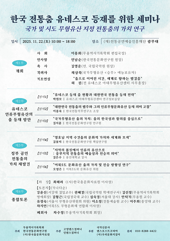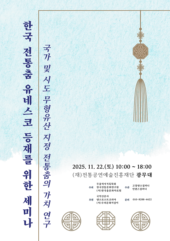 ¿ì¸® ÀüÅëÃãÀÇ À¯³×½ºÄÚ(UNESCO) µîÀ縦 À§ÇÑ ´ë±Ô¸ð Çмú ¼¼¹Ì³ª°¡ ¿·Á ÁÖ¸ñµÈ´Ù. Çѱ¹ÀüÅ빮ȿ¬±¸¿ø¿¡ µû¸£¸é ¿À´Â 11¿ù 22ÀÏ ÀüÅëÁøÈ¼úÁøÈïÀç´Ü ±¤¹«´ë¿¡¼ ¡®±¹°¡ ¹× ½Ãµµ ¹«ÇüÀ¯»ê ÁöÁ¤ ÀüÅëÃãÀÇ °¡Ä¡¿¬±¸¡¯¸¦ ÁÖÁ¦·Î Çѱ¹ ÀüÅëÃã À¯³×½ºÄÚ Àηù¹«ÇüÀ¯»ê µîÀ縦 ±â¿øÇÏ´Â ¼¼¹Ì³ª°¡ ¿¸°´Ù.