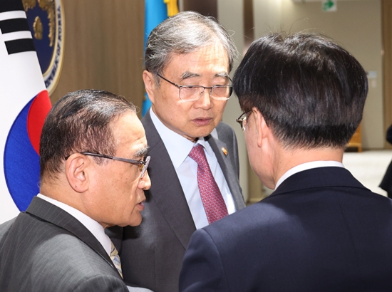 ¡ã 4ÀÏ ¿ë»ê ´ëÅë·É½Ç¿¡¼­ ¿­¸° ±¹¹«È¸ÀÇ¿¡¼­ À§¼º¶ô ±¹°¡¾Èº¸½ÇÀå(¿ÞÂʺÎÅÍ), Á¶Çö ¿Ü±³ºÎ Àå°ü, ±èÁ¤°ü »ê¾÷ºÎ Àå°üÀÌ ´ëÈ­Çϰí ÀÖ´Ù. ¿¬ÇÕ´º½º