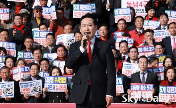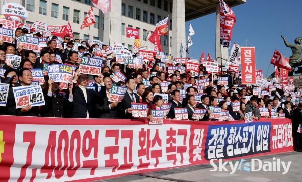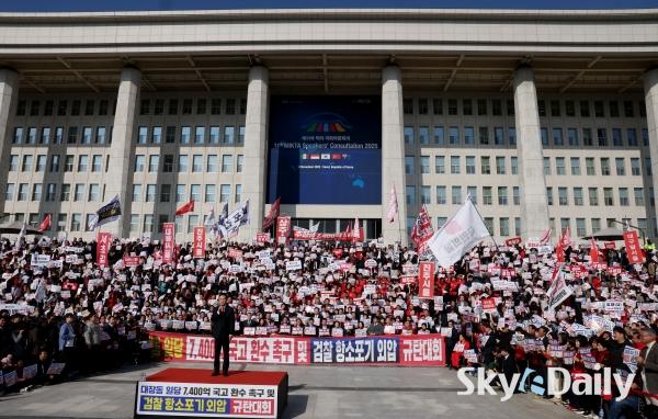 ¡ã À嵿Çõ ±¹¹ÎÀÇÈû ´ëÇ¥°¡ 12ÀÏ ¿ÀÀü ¼¿ï ¿©Àǵµ ±¹È¸ º»Ã» °è´Ü¿¡¼ ´ëÀ嵿 ÀÏ´ç 7400¾ï ±¹°í ȯ¼ö Ã˱¸ ¹× °ËÂû Ç×¼Ò Æ÷±â ¿Ü¾Ð ±Ôź´ëȸ¿¡¼ ¹ß¾ðÇϰí ÀÖ´Ù. À̳¯ Àå ´ëÇ¥´Â Ư°ËÀÌ ³»¶õ ¼±Àü¡¤¼±µ¿ ÇøÀÇ·Î °í¹ßµÈ Ȳ±³¾È Àü ÃѸ®¸¦ üÆ÷ÇÏÀÚ ¡°ÀÌ ¹«µµÇÑ Á¤±ÇÀÌ ´ëÀ嵿 Ç×¼Ò Æ÷±â¸¦ µ¤±â À§Çؼ ¿À´Ã Ȳ Àü ÃѸ®¸¦ ±ä±Þ üÆ÷Çϰí Áö±Ý ¾Ð¼ö¼ö»öÀ» Çϰí ÀÖ´Ù¡±¸ç ¡°ÀüÀïÀÌ´Ù. ¿ì¸®°¡ Ȳ±³¾ÈÀÌ´Ù. ¹¶Ãļ ½Î¿ìÀÚ¡±°í ¿ÜÃÆ´Ù. ¹Ú¹Ì³ª ±âÀÚ ¨Ï½ºÄ«À̵¥Àϸ®