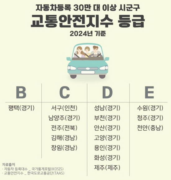 ÆòÅýà ±³Åë¾ÈÀüÁö¼ö µî±ÞÀº 30¸¸ ´ë ÀÌ»ó ÀÚµ¿Â÷°¡ µî·ÏµÈ Àü±¹ ½Ã±º±¸ Áß °¡Àå ³ôÀº °ÍÀ¸·Î ³ªÅ¸³µ´Ù. ÀÚµ¿Â÷µî·Ï 30¸¸ ´ë ÀÌ»ó ½Ã±º±¸´Â ÃÑ 16°³·Î ÆòÅýø¦ Á¦¿ÜÇÑ 15°³ ½Ã±º±¸´Â C~Eµî±Þ¿¡ ¸Ó¹°·¶´Ù.