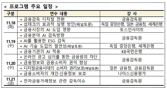À̹ø ¿¬¼ö¿¡´Â ºê·ç³ªÀÌ, įº¸µð¾Æ, Àεµ, Àεµ³×½Ã¾Æ, Ä«ÀÚÈ彺ź, ۸£±â½º½ºÅº, ¸ð¸®¼Å½º, ¸ù°ñ, ´ºÁú·£µå, Çʸ®ÇÉ, ű¹ µî 11°³±¹ ±ÝÀ¶°¨µ¶±â°üÀÌ Âü¿©ÇÑ´Ù. Âü°¡ÀÚµéÀº µðÁöÅÐÈ¿Í ÀΰøÁö´É(AI) µµÀÔÀÌ ±ÝÀ¶½ÃÀå°ú °¨µ¶ ȯ°æÀ» ¾î¶»°Ô ¹Ù²Ù°í ÀÖ´ÂÁö, °¢±¹ÀÌ ¾î¶² ±ÔÀ²°ú °¨µ¶ ü°è¸¦ µµÀÔÇϰí ÀÖ´ÂÁö¿¡ ´ëÇÑ ÀÚ±¹ »ç·Ê¸¦ ¹ßÇ¥ÇÏ°í »óÈ£ Åä·ÐÀ» ¹úÀÏ ¿¹Á¤ÀÌ´Ù.