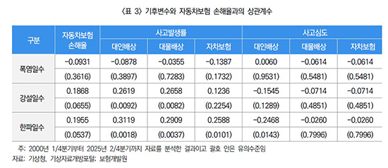 º¸Ç迬±¸¿øÀº 2000³âºÎÅÍ 2025³â »ó¹Ý±â±îÁöÀÇ ±â»óû¡¤º¸ÇèÅë°è¸¦ ºÐ¼®ÇÑ ¡®Æø¼³¡¤ÇÑÆÄ µî ±âÈĺ¯ÈÀÇ ÀÚµ¿Â÷º¸Çè¿¡ ´ëÇÑ ¿µÇ⡯ º¸°í¼¸¦ 10ÀÏ ¹ß°£Çϰí, °Ü¿ïö °¼³ Àϼö¿Í ÇÑÆÄ Àϼö°¡ ´Ã¾î³ È帧°ú ÀÚµ¿Â÷º¸Çè ¼ÕÇØÀ² °£ÀÇ »ó°ü°ü°è¸¦ Á¦½ÃÇß´Ù. 2012³â ÀÌÈÄ ¿ì¸®³ª¶ó´Â ÀÚµ¿Â÷ÀÇ ÀÏÆò±Õ ÁÖÇà°Å¸®°¡ ÁÙ¾îµå´Â È帧 ¼Ó¿¡¼µµ °Ü¿ïö ±âÈĺ¯È´Â ¼ÕÇØÀ² ¾ÇÈ ¿äÀÎÀ¸·Î ÀÛ¿ëÇϰí ÀÖ´Ù´Â °ÍÀÌ´Ù.