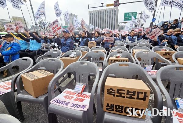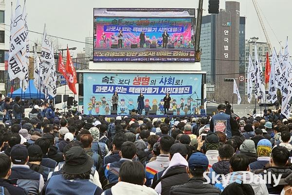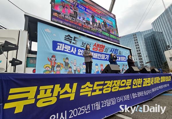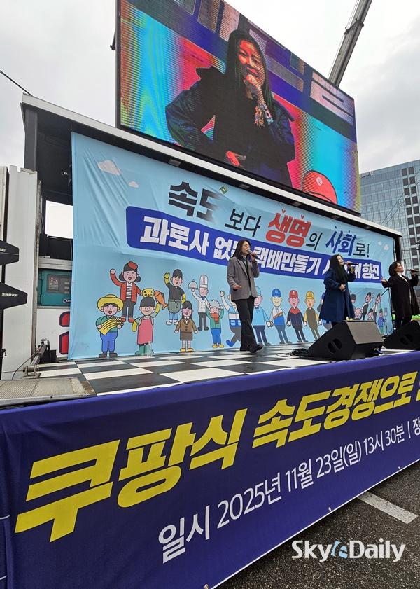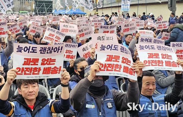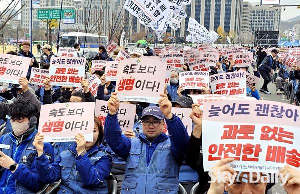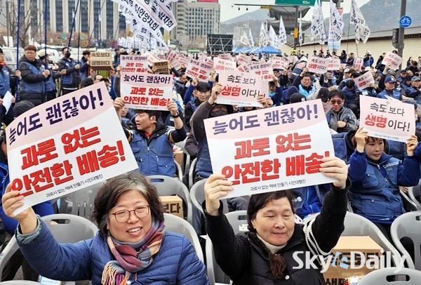 ¡ã Åùè³ëµ¿ÀÚ¿Í ½Ã¹Î´Üü µîÀÌ °á¼ºÇÑ '°ú·Î»ç ¾ø´Â Åù踸µé±â ½Ã¹Î´ëÇàÁø ±âȹ´Ü'ÀÌ 23ÀÏ ¼¿ïÁ¾·Î±¸ µ¿½ÊÀÚ°¢ ¾Õ¿¡¼ »õº®¹è¼Û ÃÖ¼ÒÈ µî ¾ÈÀüÇÑ Åùè½Ã½ºÅÛÀ» ÁÖÀåÇÏ´Â Áýȸ¸¦ ÁøÇàÇϰí ÀÖ´Ù. »õº®¹è¼ÛÀ» µÑ·¯½Ñ ³íÀïÀº Áö³´Þ 22ÀÏ Åùè³ëÁ¶°¡ ³ëµ¿ÀÚÀÇ ¼ö¸é½Ã°£°ú °Ç°±ÇÀ» ÀÌÀ¯·Î ¹ã 0~5½Ã ¡®Ãʽɾ߹è¼Û¡¯ Á¦ÇÑÀ» ¿ä±¸ÇÏ¸é¼ Ã˹ߵƴÙ. ÀÌ¿¡ ´ëÇØ ÄíÆÎ³ëÁ¶¿Í ¼ÒºñÀÚ´Üü µîÀº ÀÏÇÒ ±Ç¸®¿Í ¼ÒºñÀÚ ÆíÀÍÀ» ÀÌÀ¯·Î »õº®¹è¼Û Á¦ÇÑ¿¡ ¹Ý´ëÇϰí ÀÖ´Ù. ÀÌÁ¾¿ø ±âÀÚ ¨Ï½ºÄ«À̵¥Àϸ®