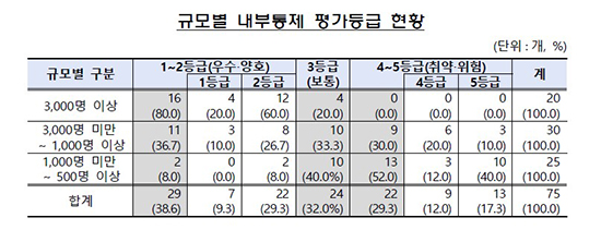 ±ÝÀ¶°¨µ¶¿øÀÌ 26ÀÏ ¹ßÇ¥ÇÑ ¡®´ëÇü ¹ýÀκ¸Çè´ë¸®Á¡(GA)ÀÇ 2024³âµµ ³»ºÎÅëÁ¦ ½ÇÅ Æò°¡ °á°ú¡¯¿¡ µû¸£¸é À۳⠱âÁØ ¼Ò¼Ó ¼³°è»ç 500¸í ÀÌ»ó ´ëÇü GA 75°³ »ç¸¦ ´ë»óÀ¸·Î ³»ºÎÅëÁ¦ ¼öÁØÀ» Á¡°ËÇÑ °á°ú, 1¡¤2µî±Þ(¿ì¼ö¡¤¾çÈ£) GA´Â 29°³ »ç(38.6%), 3µî±Þ(º¸Åë)Àº 24°³ »ç(32.0%)¿´´Ù. 4¡¤5µî±Þ(Ãë¾à¡¤À§Çè)À¸·Î Æò°¡µÈ °÷Àº 22°³ »ç(29.3%)·Î ´ëÇü GA 10°÷ Áß 3°÷Àº ³»ºÎÅëÁ¦ Àü¹Ý¿¡ °³¼±ÀÌ ½Ã±ÞÇÑ °ÍÀ¸·Î ÆÇ´ÜµÆ´Ù.