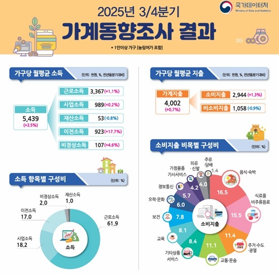±¹°¡µ¥ÀÌÅÍó°¡ 27ÀÏ ¹ßÇ¥ÇÑ 2025³â 3ºÐ±â °¡°èµ¿ÇâÁ¶»ç¿¡ µû¸£¸é Àü±¹ °¡±¸ÀÇ ¿ùÆò±Õ ¼ÒµæÀº 543¸¸9õ¿øÀ¸·Î Àü³âµ¿ºÐ±âº¸´Ù 3.5% ´Ã¾úÁö¸¸, ¼ÒºñÁöÃâÀº ¹°°¡¸¦ °¨¾ÈÇÑ ½ÇÁú ±âÁØÀ¸·Î 3ºÐ±â ¿¬¼Ó ÁÙ¾î °¡°è¿¡ ³²´Â µ·ÀÌ ¿ª´ë ÃÖ´ë ¼öÁرîÁö ´Ã¾ú´Ù.