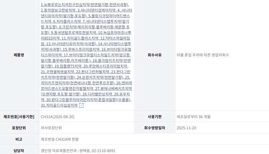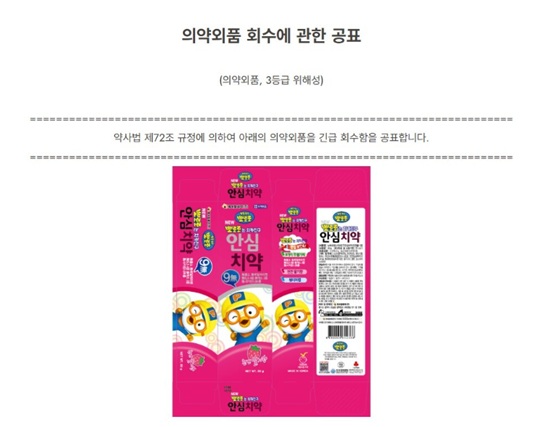 ¹®Á¦°¡ µÈ Á¦Ç°Àº ¿µÀ¯¾Æ¿Í ¾î¸°À̸¦ ´ë»óÀ¸·Î ÆÇ¸ÅµÈ Ä¡¾àÀ¸·Î Àαâ ij¸¯ÅÍ ¡®»Ç·Î·Î¡¯¸¦ Ȱ¿ëÇØ Àü±¹ ¿ÀÇÁ¶óÀÎ ¸ÅÀå°ú ¿Â¶óÀθô¿¡¼ ´ë·® À¯ÅëµÆ´Ù. Á¦Á¶¹øÈ£´Â CH31A, Á¦Á¶ÀÏÀÚ´Â 2023³â 8¿ù 31ÀÏÀ̸ç À¯È¿±â°£Àº 2026³â 8¿ù 30ÀϱîÁö·Î È®ÀεƴÙ.