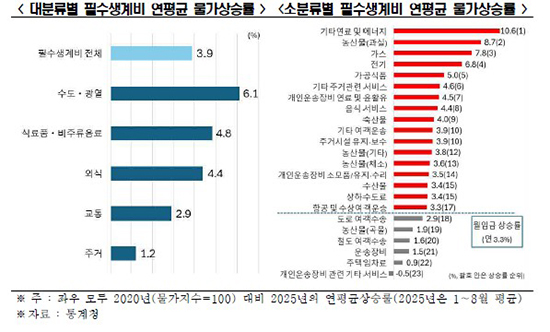 »ýȰ¹°°¡ »ó½Âµµ ÀÓ±ÝÀλó È¿°ú¸¦ °¦¾Æ¸Ô¾ú´Ù. Çʼö»ý°èºñ ¹°°¡´Â ¿¬Æò±Õ 3.9% »ó½ÂÇØ °°Àº ±â°£ ±Ù·ÎÀÚ ¿ùÀÓ±Ý »ó½Â·üÀÎ ¿¬ 3.3%¸¦ ¿ôµµ´Â ¼öÁØÀÌ´Ù. ¼öµµ¡¤Àü±â¡¤°¡½º µî ±¤¿­ºñ°¡ ¿¬ 6.1%·Î °¡Àå Å©°Ô ¿Ã¶ú°í ½Ä·áǰ¡¤ºñÁÖ·ù À½·á°¡ 4.8%, ¿Ü½ÄÀÌ 4.4%, ±³Åëºñ°¡ 2.9%, Áְźñ°¡ 1.2%¾¿ ¿Ã¶ú´Ù.