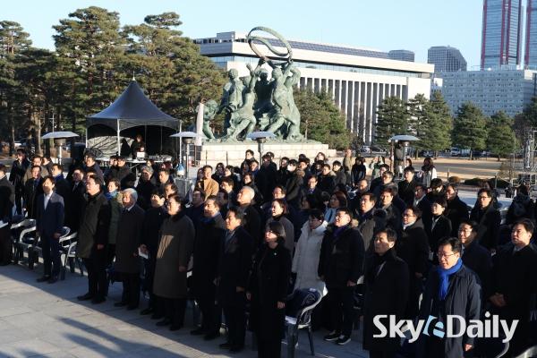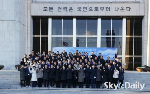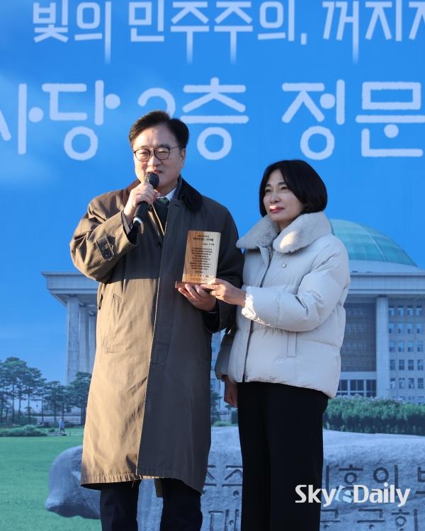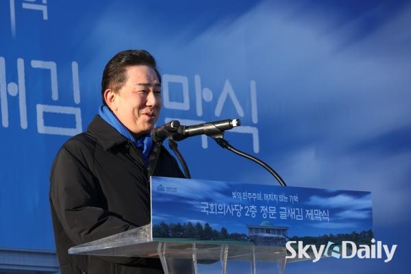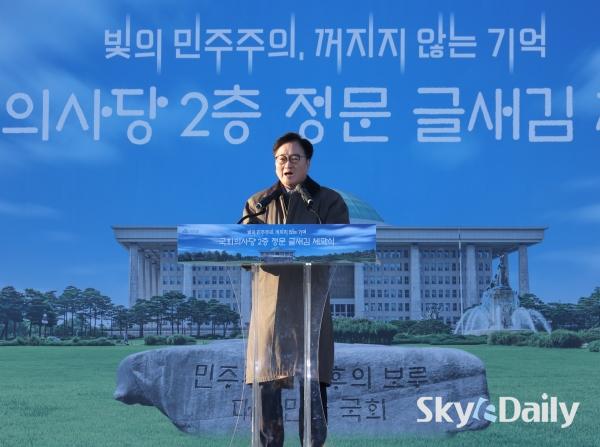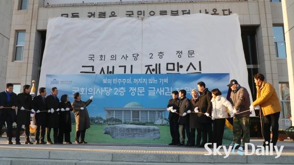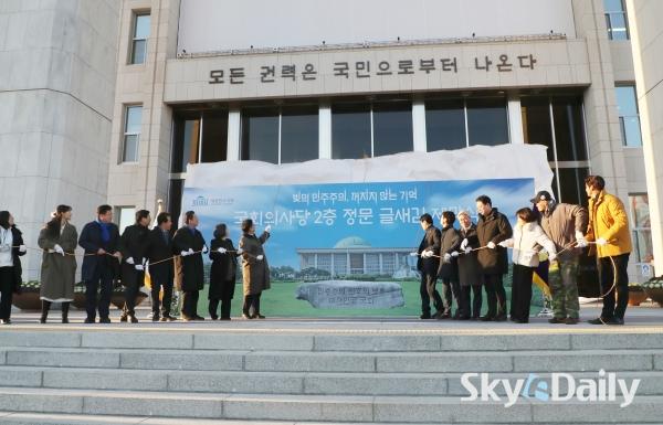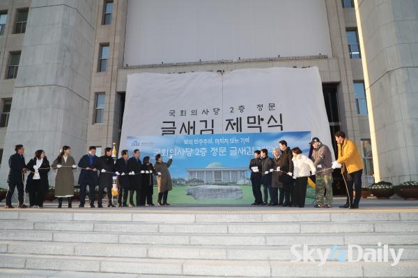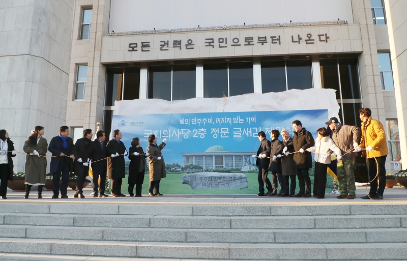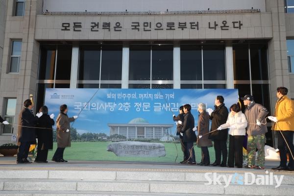 ¡ã 3ÀÏ ¿ÀÈÄ ±¹È¸ÀÇ»ç´ç 2Ãþ Á¤¹®(Á¤Çö°ü)¿¡¼­ ¿ì¿ø½Ä ±¹È¸ÀÇÀå°ú Á¤´ç ¿ø³»´ëÇ¥ µîÀÌ Âü¼®ÇÏ´Â °¡¿îµ¥ ¹ÎÁÖÁÖÀÇ ¼öÈ£ ÀÇÁö¸¦ È®°íÈ÷ Çϱâ À§ÇÑ ¡®±Û»õ±è Á¦¸·½Ä¡¯ ÀÌ ¿­¸®°í ÀÖ´Ù. ¹Ú¹Ì³ª ±âÀÚ ¨Ï½ºÄ«À̵¥Àϸ®