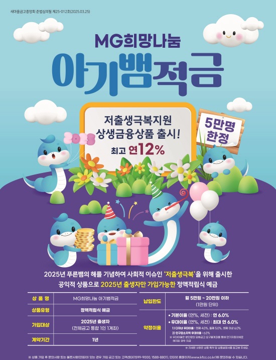 »õ¸¶À»±Ý°í´Â 2023³â ¡®±øÃÑÀû±Ý¡¯, 2024³â ¡®¿ë¿ëÀû±Ý¡¯, 2025³â ¡®¾Æ±â¹ìÀû±Ý¡¯À» ºñ·ÔÇØ MG²Þ³ª¹«Àû±Ý, MGÇѰ¡À§Àû±Ý µî ´Ù¾çÇÑ Áö¿ø »ç¾÷À» À̾î¿À°í ÀÖ´Ù. °°Àº Á¶°ÇÀ¸·Î Ãâ½ÃµÈ ¿ë¿ëÀû±ÝÀº ¸¶°¨ÀϱîÁö 99.13%°¡ ÆÇ¸ÅµÈ ¹Ù ÀÖ´Ù.
