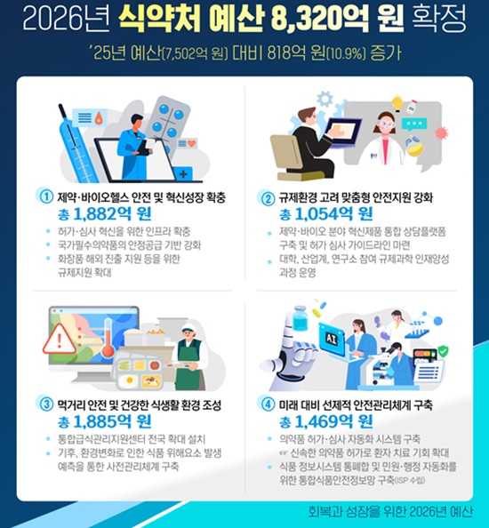 ½Ä¾àó´Â 2026³âµµ ¿¹»êÀ» ¿ÃÇØ 7502¾ï ¿ø ´ëºñ 818¾ï¿ø Áõ°¡(10.9%)ÇÑ ÃÑ 8320¾ï ¿øÀ¸·Î ÃÖÁ¾ È®Á¤Çß´Ù°í 4ÀÏ ¹àÇû´Ù.