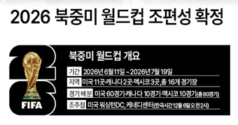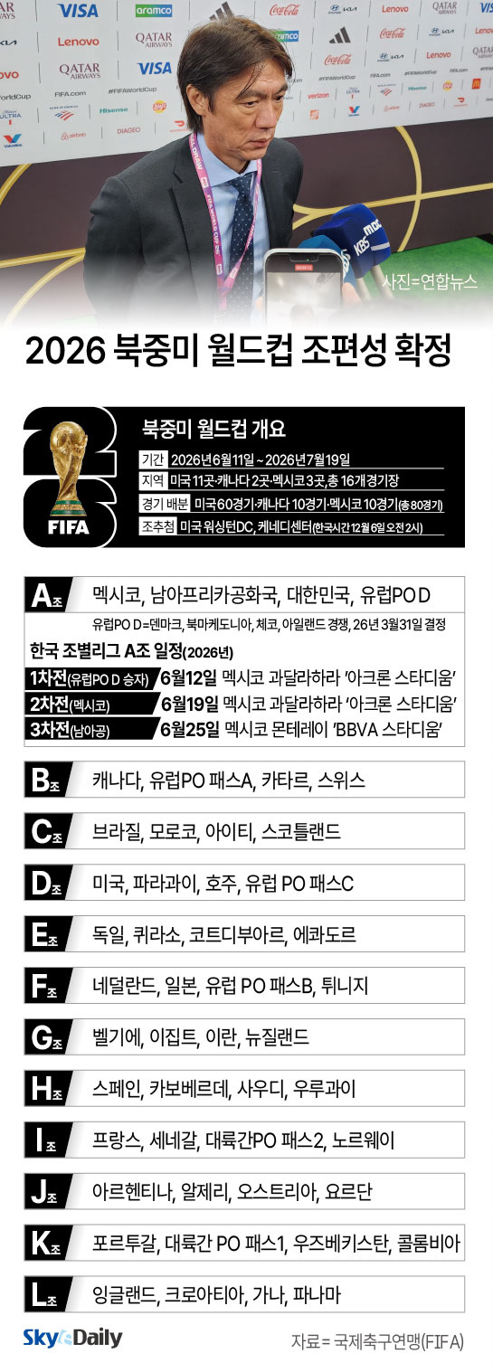 Çѱ¹ Ã౸ ´ëÇ¥ÆÀÀÇ 2026 ±¹Á¦Ã౸¿¬¸Í(FIFA) ºÏÁß¹Ì ¿ùµåÄÅ Á¶º°¸®±× »ó´ë°¡ È®Á¤µÆ´Ù. Çѱ¹Àº 6ÀÏ(Çѱ¹½Ã°£) ¹Ì±¹ ¿ö½ÌÅÏDCÀÇ Äɳ׵𠼾ÅÍ¿¡¼­ ¿­¸° ºÏÁ߹̿ùµåÄÅ Á¶Ãß÷¿¡¼­ ¸ß½ÃÄÚ, ³²¾ÆÇÁ¸®Ä«°øÈ­±¹, ±×¸®°í À¯·´ Ç÷¹ÀÌ¿ÀÇÁ(PO) ½ÂÀÚ¿Í ÇÔ²² AÁ¶¿¡ ¹èÁ¤µÆ´Ù.
