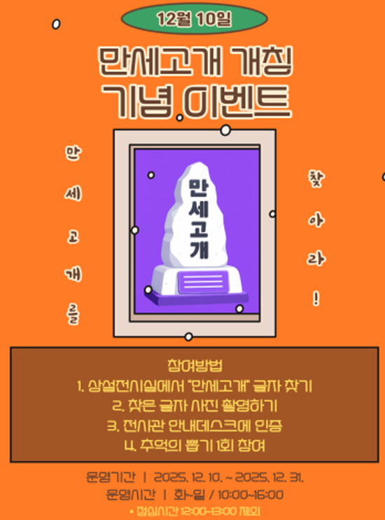 À̹ø ÇÁ·Î±×·¥Àº »ó¼³Àü½Ã½Ç¿¡¼­ ¡®¸¸¼¼°í°³¡¯¶ó´Â ±ÛÀÚ¸¦ ã¾Æ ÃÔ¿µÇÏ°í ¾È³»µ¥½ºÅ©¿¡¼­ ÀÎÁõÇÏ¸é ±â³ä°üÀÌ Á÷Á¢ Á¦ÀÛÇÑ ¡®Ãß¾ïÀÇ Çà¿î »Ì±â¡¯ À̺¥Æ®¿¡ 1ȸ Âü¿©ÇÒ ¼ö ÀÖ´Â ¹æ½ÄÀ¸·Î ÁøÇàµÈ´Ù. ±â³äǰÀº ÃÑ 5Á¾À¸·Î ±¸¼ºµÇ¸ç ¼±Âø¼ø 100¸í¿¡°Ô Á¦°øµÈ´Ù.