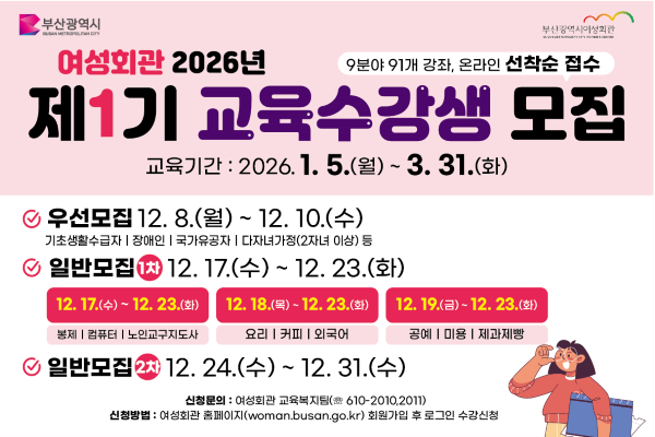 8ÀÏ ºÎ»ê½Ã´Â ½Ã ¿©¼ºÈ¸°üÀÌ ¡®2026³â Á¦1±â ±³À°°úÁ¤¡¯ ¼ö°»ýÀ» ¸ðÁýÇÏ¸ç ±³À°Àº ³»³â 1¿ù5ÀϺÎÅÍ 3¿ù31ÀϱîÁö ¾à 3°³¿ù°£ ÁøÇàÇÑ´Ù°í ¹àÇû´Ù.