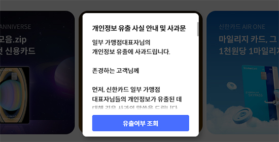 »ç°í´Â ½ÅÇÑÄ«µå ³»ºÎÁ÷¿øÀÌ ½Å±Ô Ä«µå¸ðÁýÀ» À§ÇØ °¡¸ÍÁ¡ ´ëÇ¥ÀÇ °³ÀÎÁ¤º¸¸¦ ¿ÜºÎ·Î À¯ÃâÇÑ °ÍÀ¸·Î ÆÄ¾ÇµÆ´Ù. ½ÅÇÑÄ«µå´Â ÇØ´ç »ç½ÇÀ» È®ÀÎÇÑ µÚ 23ÀÏ °³ÀÎÁ¤º¸º¸È£À§¿øÈ¸¿¡ À¯Ãâ »ç½ÇÀ» ½Å°íÇß°í, Á¤º¸ À¯Ãâ ÇÇÇØÀڵ鿡°Ôµµ °³º° ÅëÁö¸¦ ½Ç½ÃÇß´Ù.