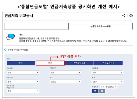 ±Ý°¨¿øÀº 25ÀÏ ¹ßÇ¥ÇÑ ¡®±ÝÀ¶»óǰ ºñ±³°ø½Ã½Ã½ºÅÛ¿¡ ´ëÇÑ ¸¸Á·µµ Á¶»ç °á°ú ¹× °³¼± °èȹ¡¯¿¡¼ ¡®ÅëÇÕ¿¬±ÝÆ÷ÅС¯¿¡ ¿¬±ÝÀúÃà»óǰ °ø½Ã¸¦ È®´ëÇÑ´Ù°í ¹àÇû´Ù. ±×µ¿¾È ÅëÇÕ¿¬±ÝÆ÷ÅÐÀº ¿¬±ÝÀúÃࡤ½ÅŹ¡¤ÆÝµå¡¤º¸ÇèÀÇ ¼öÀÍ·ü°ú ¼ö¼ö·áÀ² µîÀ» ºÐ±âº°·Î Á¦°øÇØ ¿ÔÁö¸¸ »óÀåÁö¼öÆÝµå(ETF) °ü·Ã Á¤º¸´Â Á¦°øÇÏÁö ¾Ê¾Ò´Ù.