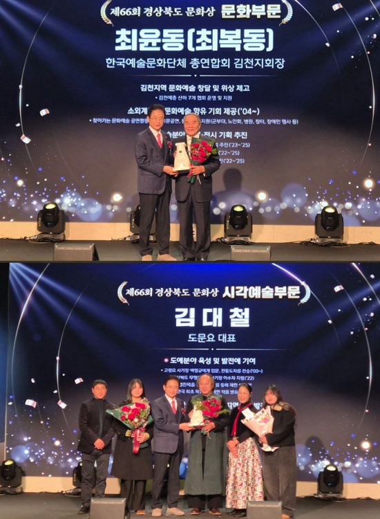Á¦66ȸ °æ»óºÏµµ ¹®È»ó ½Ã»ó½Ä¿¡¼ ±èõ½Ã ÃÖº¹µ¿ Çѱ¹¿¹ÃÑ ±èõÁöȸÀåÀÌ ¹®ÈºÎ¹®¿¡¼, ±è´ëö µµ¹®¿ä ´ëÇ¥°¡ ½Ã°¢¿¹¼ú ºÎ¹®¿¡¼ Áö¿ª¹®È¿¹¼ú¹ßÀü¿¡ À̹ÙÁöÇÑ Àι°·Î ¼±Á¤µÇ´Â ¿µ¿¹¸¦ ¾È¾Ò´Ù.