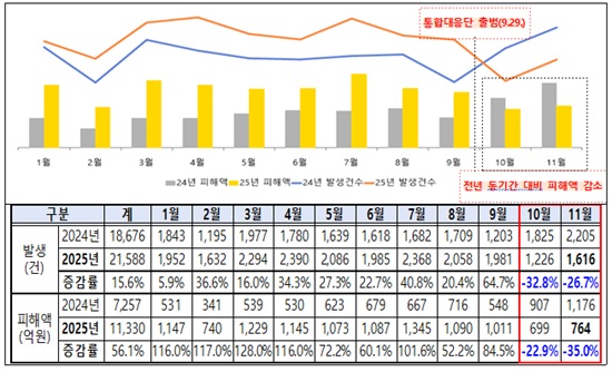 ƯÈ÷ ÇÇÇØÁöÇ¥ º¯È°¡ ÁÖ¸ñµÈ´Ù. ¿ÃÇØ 11¿ù±îÁö ´©Àû ±âÁØÀ¸·Î´Â ¹ß»ý °Ç¼ö¿Í ÇÇÇØ¾×ÀÌ °¢°¢ Àü³â ´ëºñ 15.6%, 56.1% Áõ°¡ÇßÁö¸¸, ´ëÃ¥ÀÌ º»°Ý °¡µ¿µÈ 10~11¿ù¿¡´Â Àü³â µ¿±â ´ëºñ ¶Ñ·ÇÇÑ °¨¼Ò¼¼·Î ÀüȯµÆ´Ù.