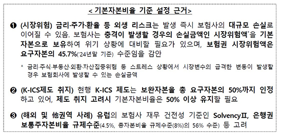 ´ç±¹ÀÌ Á¦½ÃÇÑ ±âÁغñÀ² 50%´Â ½ÃÀåÃæ°Ý ´ëÀÀ Çʿ伺¿¡ ±â¹ÝÇÑ´Ù. ±Ý¸®¡¤ÁÖ°¡¡¤È¯À² µî ¿Ü»ý ¸®½ºÅ©´Â ¹ß»ý Áï½Ã ´ë±Ô¸ð ¼Õ½Ç·Î À̾îÁú ¼ö ÀÖ¾î, ½ºÆ®·¹½º »óȲ¿¡¼ÀÇ ¼Õ½Ç±Ý¾×(½ÃÀåÀ§Çè¾×)À» ±âº»ÀÚº»À¸·Î º¸À¯ÇÒ Çʿ䰡 ÀÖ´Ù´Â ¼³¸íÀÌ´Ù. ´ç±¹Àº 2024³â ¸» ±âÁØ º¸Çè±Ç ½ÃÀåÀ§Çè¾×ÀÌ ¿ä±¸ÀÚº»ÀÇ 45.7% ¼öÁØÀ̶ó´Â Á¡µµ ÇÔ²² Á¦½ÃÇß´Ù.
