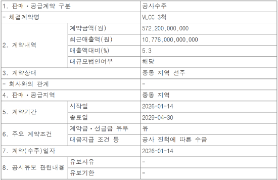 À̹ø °è¾àÀº ÇÑÈ¿À¼Ç 2026³â ù ¼±¹Ú ¼öÁÖ °è¾àÀ̸ç ÀÛ³â 12¿ù 18ÀÏ À¯·´ Áö¿ª ¼±ÁÖ¿Í ¾×Èõ¿¬°¡½º ¿î¹Ý¼±(LNGC) 7ô °ÇÁ¶ °è¾àÀ» ü°áÇÑ Áö 27ÀÏ ¸¸ÀÇ ¼º°ú´Ù.