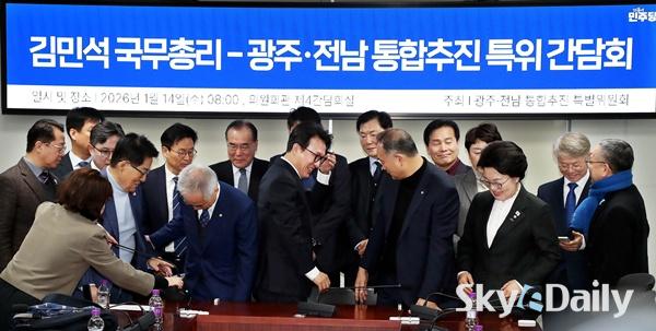 ¡ã Àü³²¡¤±¤ÁÖ ÅëÇÕÃßÄ£ Ưº°À§¿øÈ¸(°øµ¿À§¿øÀå ±è¿øÀÌ¡¤¾çºÎ³² ±¹È¸ÀÇ¿ø)´Â 14ÀÏ ¿ÀÀü ±¹È¸¿¡¼ ±è¹Î¼® ±¹¹«ÃѸ®¿Í Àü³²¡¤±¤ÁÖ ±¹È¸ÀÇ¿ø °£´ãȸ¸¦ °³ÃÖÇß´Ù. À̹ø °£´ãȸ´Â Àü³²¡¤±¤ÁÖ ÅëÇÕÀÇ Çʿ伺À» ÀçÈ®ÀÎÇϰí, ±è¹Î¼® ±¹¹«ÃѸ®¿Í Àü³²¡¤±¤ÁÖ ±¹È¸ÀÇ¿øÀÌ ÇÔ²² Àü³²¡¤±¤ÁÖ ÅëÇÕ Æ¯º°¹ý Á¦Á¤ÀÇ ¿øÄ¢°ú ¹æÇ⼺, ±Ç¿ªº° ¼÷¿ø»ç¾÷°ú Çö¾È¿¡ ´ëÇØ ÀǰßÀ» ³ª´©±â À§ÇØ ¸¶·ÃµÆ´Ù. ÀÌÁ¾¿ø ±âÀÚ ¨Ï½ºÄ«À̵¥Àϸ®