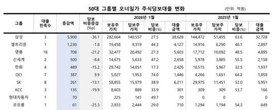 »óÀ§ 10¸í Áß ºñÁß °¨¼Ò ºñÀ²ÀÌ °¡Àå Å« Àι°Àº ±èµ¿¼± ÇÑÈ­°¶·¯¸®¾Æ ºÎ»çÀåÀ̾ú´Ù. ±è ºÎ»çÀåÀº ´ëÃ⠱ݾ×ÀÌ 2025³â 1¿ù 580¾ï ¿ø¿¡¼­ 2026³â 940¾ï ¿øÀ¸·Î ´Ã¾úÀ¸³ª º¸À¯ÁÖ °¡Ä¡´Â 707¾ï ¿ø¿¡¼­ 5021¾ï ¿øÀ¸·Î ¿À¸£¸ç ´ãº¸ ºñÁßÀÌ 64.5%p °¨¼ÒÇß´Ù.