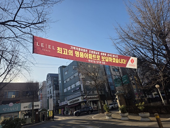 ¼¿ï ¼ÛÆÄ±¸ °¡¶ôµ¿ °¡¶ô±Øµ¿¾ÆÆÄÆ® ´ÜÁö ÀÔ±¸¿Í ³»ºÎ µµ·Î »ó°ø¿¡´Â ºÓÀº»ö ¸£¿¤ Çö¼ö¸·ÀÌ ±æ°Ô °É·Á ÀÖ´Ù. Çö¼ö¸· ÇÏ´Ü¿¡´Â ¡°·Ôµ¥°Ç¼³ ÀÓÁ÷¿ø Àϵ¿¡±À̶ó´Â ¹®±¸°¡ ºÙ¾î ÀÖ´Ù. °ø»çÀåÀÌ ¾Æ´Ñ ±¸Ãà ´ÜÁö À§·Î ÇÏÀÌ¿£µå ºê·£µå°¡ ¸ÕÀú ³»·Á¾ÉÀº ¸ð½ÀÀÌ´Ù. ¼öÁÖÀüÀÌ ³¡³µÀ½À» ¾Ë¸®´Â µ¿½Ã¿¡ ¡®¸£¿¤¡¯À̶ó´Â ´Ü¾î°¡ Á¶ÇÕ¿øµéÀÇ ±â´ëÄ¡¸¦ »ó¡ÀûÀ¸·Î °íÁ¤½ÃŰ´Â ÀåÄ¡·Î ÀÐÈù´Ù.