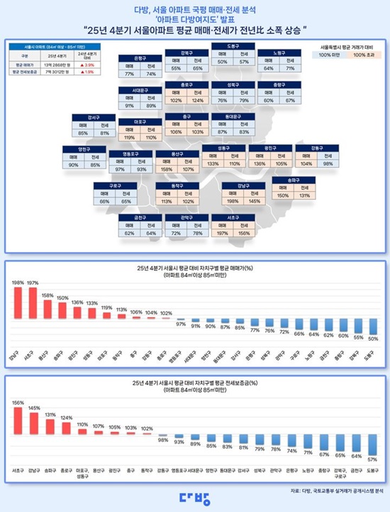 ´Ù¹æ¿©Áöµµ´Â ±¹Åä±³ÅëºÎ ½Ç°Å·¡°¡¸¦ ¹ÙÅÁÀ¸·Î ¼¿ï 25°³ ÀÚÄ¡±¸ÀÇ Æò±Õ ¸Å¸Å°¡¿Í Àü¼¼ º¸Áõ±ÝÀ» ºñ±³ÇÑ ÀÚ·á´Ù. ¼¿ï Æò±Õ ½Ã¼¼¸¦ 100%·Î µÎ°í °¢ Áö¿ª °¡°Ý ¼öÁØÀ» »ó´ëÀûÀ¸·Î º¸¿©ÁØ´Ù.