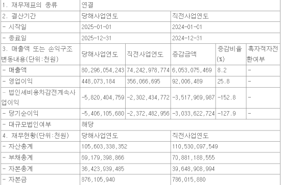 Áö³ÇØ ¸ÅÃâ¾×Àº 80Á¶2960¾ï5424¸¸3000¿øÀ¸·Î 2024³â(74Á¶2429¾ï7877¸¸4000¿ø)º¸´Ù 8.2% Áõ°¡Çß´Ù. Áö³ÇØ ¿µ¾÷ÀÌÀÍÀº 2024³â ¿µ¾÷ÀÌÀÍÀÎ 3560¾ï6669¸¸5000¿øº¸´Ù 920¾ï648¸¸9000¿ø Áõ°¡ÇØ 25.8%ÀÇ Áõ°¨·üÀ» ±â·ÏÇß´Ù. ´Ù¸¸ 2025³â ¿¬°£ ¼øÀÌÀÍÀº 5Á¶4061¾ï568¸¸ ¿ø °¨¼ÒÇß´Ù.
