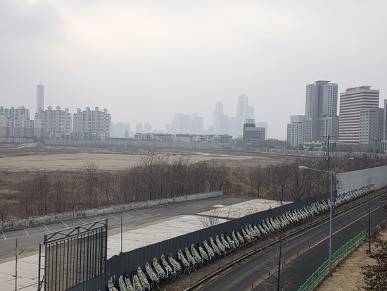 ¡ã 4ÀÏ ¼­¿ï ¿ë»ê±¹Á¦¾÷¹«Áö±¸(¿ë»êÁ¤ºñâ) ¿¹Á¤Áö Àü°æ. Ææ½º ¹Ù±ù µµ·Î¸¦ µû¶ó ÁֹεéÀÌ º¸³½ ±ÙÁ¶È­È¯ÀÌ ±æ°Ô ´Ã¾î¼­ ÀÖ°í, ¾ÈÂÊÀº °Ü¿ï °øÅÍ·Î ºñ¾î ÀÖ´Ù. »çÁø=ÀåÇý¿ø ±âÀÚ