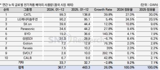 ƯÈ÷ BYDÀÇ ¼ºÀåÀÌ ´«¿¡ ¶è´Ù. BYD´Â »ç¿ë·®ÀÌ 140.3% Áõ°¡Çϸç 5À§¿¡ ¿Ã¶ú´Ù. ¹èÅ͸®¿Í Àü±âÂ÷(BEV¡¤PHEV)¸¦ ÀÚü »ý»êÇÏ´Â ±¸Á¶¿Í °¡°Ý °æÀï·ÂÀ» ¹ÙÅÁÀ¸·Î ÇØ¿Ü ½ÃÀå ÀÔÁö¸¦ ºü¸£°Ô ³ÐÈ÷°í ÀÖ´Ù. À¯·´ ³» BYD ¹èÅ͸® »ç¿ë·®Àº 2025³â 14.9GWh·Î Àü³â ´ëºñ 201.4% Áõ°¡Çß´Ù. BYD ¿ª½Ã ¿ø°¡ °æÀï·Â È®º¸¸¦ À§ÇØ ³ªÆ®·ýÀ̿ ¹èÅ͸® ÅõÀÚ¸¦ È®´ëÇϰí ÀÖ´Ù.