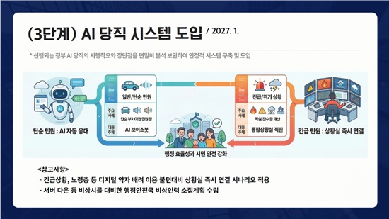 ³»³â 1¿ùºÎÅÍ´Â 3´Ü°è ¡®AI ´çÁ÷ ½Ã½ºÅÛ¡¯À» º»°Ý °¡µ¿ÇÑ´Ù. ¾ß°£½Ã°£ 󸮰¡ ºÒ°¡´ÉÇÑ ´Ü¼ø ºÎ¼ À̰ü ¹Î¿ø µîÀº AI º¸À̽ºº¿ÀÌ 24½Ã°£ ÀÚµ¿ Á¢¼öÇϰí, ±ä±Þ »óȲ¡¤º¹ÇÕ ¹Î¿øÀº Áï½Ã ÅëÇÕ»óȲ½Ç·Î ÀÚµ¿ ¿¬µ¿µÇ´Â AI-Àΰ£ Çù¾÷ ¹æ½ÄÀÌ´Ù. ³ë·ÉÃþ µî µðÁöÅÐ ¾àÀÚ¸¦ À§ÇÑ Áï½Ã ¿¬°á ¼ºñ½º¿Í Àå¾Ö ´ëºñ ºñ»ó Àη ü°èµµ ¸¶·ÃÇÑ´Ù.