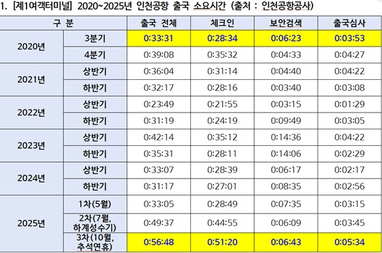 ÀÎõ±¹Á¦°øÇ×°ø»ç ÀÚ·á¿¡ µû¸£¸é 2020³â Ãß¼® ´ç½Ã Á¦1¿©°´Å͹̳ΠÃâ±¹ ¼Ò¿ä½Ã°£(Ãâ±¹Àå ´ë±â¡æº¸¾È°Ë»ö¡æÃâ±¹½É»ç)Àº 39ºÐ 8ÃÊ¿´Áö¸¸ Áö³ÇØ Ãß¼®¿¡´Â 56ºÐ 48ÃÊ·Î 45% Áõ°¡Çß´Ù. °°Àº ±â°£ Á¦2Å͹̳ÎÀº 40ºÐ 21ÃÊ·Î Å͹̳Π°£ ÃÖ´ë 16ºÐ 27ÃÊÀÇ °ÝÂ÷°¡ ¹ß»ýÇß´Ù. Á¤ ÀÇ¿øÀº µ¿ÀÏÇÑ ±¹°¡ °ü¹® °øÇ׿¡¼ Å͹̳ο¡ µû¶ó ü°¨ ½Ã°£ÀÌ 15ºÐ ÀÌ»ó Â÷ÀÌ ³ª´Â °ÍÀº ¿î¿µ È¿À²¼º°ú ÇüÆò¼º Ãø¸é¿¡¼ ½É°¢ÇÑ ¹®Á¦¶ó°í ÁöÀûÇß´Ù.