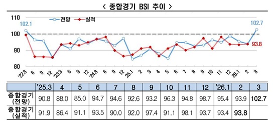 2026³â 3¿ù BSI Àü¸ÁÄ¡´Â 102.7À» ±â·ÏÇß´Ù. Á¾ÇÕ BSI Àü¸ÁÄ¡°¡ ±âÁؼ± 100À» »óȸÇÑ °ÍÀº 2022³â 3¿ù(102.1) ÀÌÈÄ 4³â ¸¸ÀÌ´Ù.