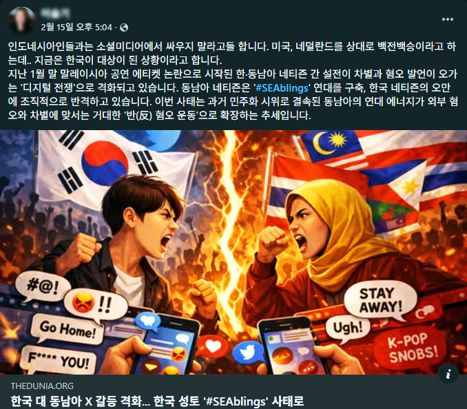 Çѱ¹°ú µ¿³²¾Æ ´©¸®²ÛÀÇ °¥µî ³¡¿¡ ¹ú¾îÁø ½Ãºí¸µ½º(SEAblings) »çŰ¡ ´«»ìÀ» ÂîǪ¸®°Ô ÇÑ´Ù. »ç°ÇÀÇ ¹ß´ÜÀº ¿ÃÇØ 1¿ù 31ÀÏ ¸»·¹À̽þƿ¡¼ ¿¸° µ¥À̽ĽºÀÇ K-ÆË ÄܼƮ¿´´Ù. Çѱ¹ÀÎÀÌ ¸Á¿ø·»Á ÀåÂøÇÑ ÀÏ¸í ´ëÆ÷Ä«¸Þ¶ó¸¦ ¹ÝÀÔÇß´Ù°¡ º¸¾È¿ä¿ø¿¡°Ô Á¦Áö¸¦ ´çÇß´Ù. ´ç½Ã ÇöÁö °ü°´ÀÌ ¸»´ÙÅùÀ» ÂïÀº ¿µ»ó°ú »çÁøÀ» °øÀ¯ÇÏÀÚ ÀϺΠÇѱ¹ÀÎÀÌ µ¿³²¾Æ½Ã¾Æ¸¦ ºñÇÏÇÏ¸é¼ °¥µîÀº Ä¿Á³´Ù. Àεµ³×½Ã¾Æ¿Í Å±¹, Çʸ®ÇÉ, º£Æ®³² ´©¸®²ÛµéÀº µ¿³²¾Æ½Ã¾Æ(SEA)¿Í ÇüÁ¦ÀÚ¸Å(siblings) ÇÕ¼º¾îÀÎ ½Ãºí¸µ½º¸¦ ÇØ½Ãű׷Π´Þ¸ç Çѱ¹¿¡ ´ëÇÑ ¹Ý°¨À» µå·¯³Â´Ù.