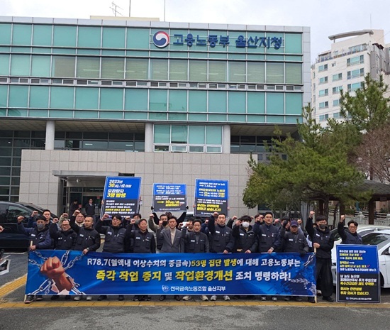 ¹ÎÁÖ³ëÃÑ Àü±¹±Ý¼Ó³ëµ¿Á¶ÇÕ ¿ï»êÁöºÎ´Â 25ÀÏ °í¿ë³ëµ¿ºÎ ¿ï»êÁöû ¾Õ¿¡¼ ȸ°ßÀ» ¿¾î À̰°ÀÌ ¹àÈ÷°í °í¿ë³ëµ¿ºÎ¿¡ ´ëÇØ Áï°¢ ÀÛ¾÷ ÁßÁö ¸í·É ¹× ÀÛ¾÷ȯ°æ °³¼± ¸í·É ¹ßµ¿À» Ã˱¸Çß´Ù.
