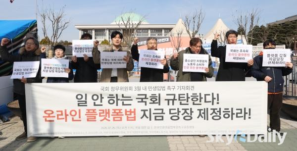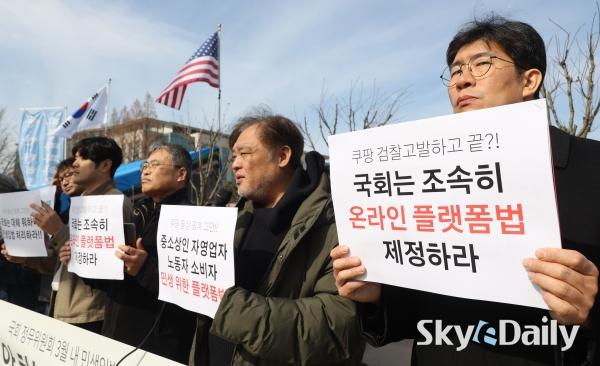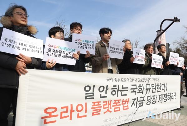 ¡ã Áß¼Ò»óÀΡ¤ÀÚ¿µ¾÷ÀÚ¡¤³ëµ¿ÀÚ¡¤½Ã¹Î»çȸ´Üü°¡ 26ÀÏ ¿©Àǵµ ±¹È¸ ¾Õ¿¡¼ ¹Î»ýÀÔ¹ýÀÎ ¿Â¶óÀÎ Ç÷§Æû¹ýÀÇ Á¦Á¤À» Ã˱¸ÇÏ´Â ±âÀÚȸ°ßÀ» ¿°í ÀÖ´Ù. À̳¯ ±âÀÚȸ°ß¿¡¼´Â ±¹È¸ Á¤¹«À§¿øÈ¸¿¡¼ ¿Â¶óÀÎ Ç÷§Æû¹ý °ü·ÃÇØ ³íÀǸ¸ Çϰí ÀÖ´Ù¸é¼ Á¤ÀÛ ½Ã±ÞÇÑ ¹Î»ýÀÔ¹ýÀÌ Áö¿¬µÇ°í ÀÖ´Â »óȲÀ» ±ÔźÇϸç Á¶¼ÓÇÑ ¹Î»ýÀÔ¹ýÀ» Ã˱¸Çß´Ù. ¹Ú¹Ì³ª ±âÀÚ ¨Ï½ºÄ«À̵¥Àϸ®