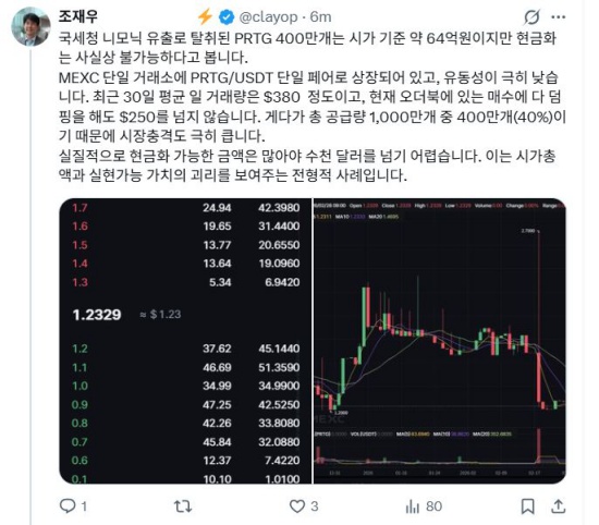 ±×´Â ¡°MEXC ´ÜÀÏ °Å·¡¼Ò¿¡ PRTG/USDT ´ÜÀÏ Æä¾î·Î »óÀåµÇ¾î ÀÖ°í, À¯µ¿¼ºÀÌ ±ØÈ÷ ³·´Ù. ÃÖ±Ù 30ÀÏ Æò±Õ ÀÏ °Å·¡·®Àº 380´Þ·¯ Á¤µµÀ̰í, ÇöÀç ¿À´õºÏ¿¡ ÀÖ´Â ¸Å¼ö ¹°·®¿¡ ¸ðµÎ ´ýÇÎÇØµµ 250´Þ·¯¸¦ ³ÑÁö ¾Ê´Â´Ù. °Ô´Ù°¡ ÃÑ °ø±Þ·® 1,000¸¸°³ Áß 400¸¸°³(40%)À̱⠶§¹®¿¡ ½ÃÀå Ãæ°Ýµµ ±ØÈ÷ Å©´Ù´Â Á¡À» °í·ÁÇÏ¸é ½ÇÁúÀûÀ¸·Î Çö±ÝÈ °¡´ÉÇÑ ±Ý¾×Àº ¸¹¾Æ¾ß ¼öõ ´Þ·¯¸¦ ³Ñ±â ¾î·Æ´Ù¡±°í ¼³¸íÇß´Ù. ÀÌ´Â ½Ã°¡ÃѾװú ½ÇÇö °¡´É °¡Ä¡ÀÇ ±«¸®¸¦ º¸¿©ÁÖ´Â ÀüÇüÀûÀÎ »ç·Ê¶ó´Â ÁöÀûÀÌ´Ù.