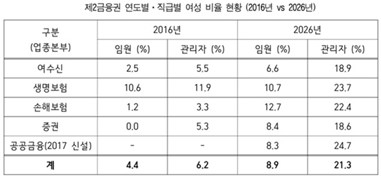 Àü±¹»ç¹«±ÝÀ¶¼ºñ½º³ëµ¿Á¶ÇÕÀº 3.8 ¼¼°è ¿©¼ºÀÇ ³¯À» ¸Â¾Æ ¿©¼ö½Å, »ý¸íº¸Çè, ¼ÕÇØº¸Çè, Áõ±Ç, °ø°ø±ÝÀ¶ µî ÃÑ 68°³ »ç¸¦ ´ë»óÀ¸·Î ½Ç½ÃÇÑ ¡®Á¦2±ÝÀ¶±Ç À¯¸®ÃµÀå ½ÇÅÂÁ¶»ç¡¯ °á°ú 2026³â ±âÁØ Á¦2±ÝÀ¶±ÇÀÇ ¿©¼º ÀÓ¿ø ºñÀ²Àº 8.9%¿¡ ºÒ°úÇß´Ù.