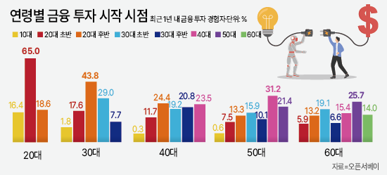 ÀÌÀü ¼¼´ëº¸´Ù ÈξÀ ´õ À̸¥ ½Ã±â¿¡ ±ÝÀ¶ ÅõÀÚ¸¦ ½ÃÀÛÇÑ´Ù´Â Á¡µµ 20´ë Ư¡ Áß Çϳª¿´´Ù. 20´ë Áß 16.4%°¡ 10´ë¿¡, 65.0%°¡ 20´ë Ãʹݿ¡ ÅõÀÚ¿¡ ÀÔ¹®Çß´Ù°í ´äÇØ ÀÌÀü ¼¼´ë¿¡ ºñÇØ ÅõÀÚ ÀÔ¹® ½Ã±â°¡ Å©°Ô ¾Õ´ç°ÜÁ³À½À» ¾Ë ¼ö ÀÖ¾ú´Ù. 60´ë°¡ 10´ë¿Í 20´ë Ãʹݿ¡ ±ÝÀ¶ ÅõÀÚ¸¦ ½ÃÀÛÇß´Ù°í ´äÇÑ ºñÁßÀÌ 6% ³»¿ÜÀÎ °Í°ú ´ëÁ¶ÀûÀ̾ú´Ù.