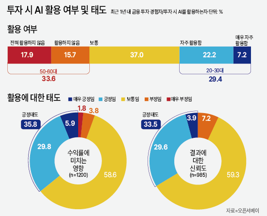2030À» Áß½ÉÀ¸·Î ±ÝÀ¶ ÅõÀÚ¿¡ AI°¡ Ȱ¿ëµÇÁö¸¸ ¼öÀÍ·ü¿¡ ´ëÇÑ ¿µÇâÀ̳ª °á°ú¿¡ ´ëÇÑ ½Å·Úµµ´Â ¾ÆÁ÷ ³ôÁö ¾ÊÀº »óȲÀÌ´Ù. ÅõÀÚ ½Ã AI Ȱ¿ë ¿©ºÎ ¹× ŵµ¿¡ ´ëÇÑ Á¶»ç¿¡¼ ¡°ÀÚÁÖ È°¿ëÇÑ´Ù¡± 22.2%, ¡°¸Å¿ì ÀÚÁÖ È°¿ëÇÑ´Ù¡± 7.2%·Î ÀüüÀÇ 30%°¡·®ÀÌ AI¸¦ Ȱ¿ëÇÑ ÅõÀÚ È°µ¿À» ¹úÀ̰í ÀÖ¾ú´Ù.