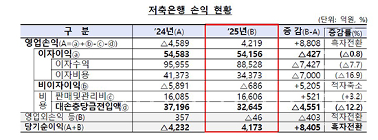 ±ÝÀ¶°¨µ¶¿øÀÌ 20ÀÏ ¹ßÇ¥ÇÑ ¡®2025³â ÀúÃàÀºÇà ¹× »óÈ£±ÝÀ¶Á¶ÇÕ ¿µ¾÷½ÇÀû ÀáÁ¤Ä¡¡¯¿¡ µû¸£¸é ÀúÃàÀºÇàÀÇ Áö³­ÇØ ¼øÀÌÀÍÀº 4173¾ï ¿øÀ¸·Î Àü³â 4232¾ï ¿ø ÀûÀÚ¿¡¼­ ÈæÀÚÀüȯÇß´Ù. ¿µ¾÷¼ÕÀ͵µ Àü³â 4589¾ï ¿ø ÀûÀÚ¿¡¼­ 4219¾ï ¿ø ÈæÀÚ·Î µ¹¾Æ¼¹´Ù. ÀÌÀÚÀÌÀÍÀº 427¾ï ¿ø ÁÙ¾úÁö¸¸ ºÎ½Ç¿©½Å °¨Ãà¿¡ µû¶ó ´ë¼ÕÃæ´ç±Ý ÀüÀÔ¾×ÀÌ 4551¾ï ¿ø °¨¼ÒÇÑ Á¡ÀÌ ½ÇÀû °³¼±ÀÇ ÇÙ½É ¹è°æÀ¸·Î ²ÅÇû´Ù.