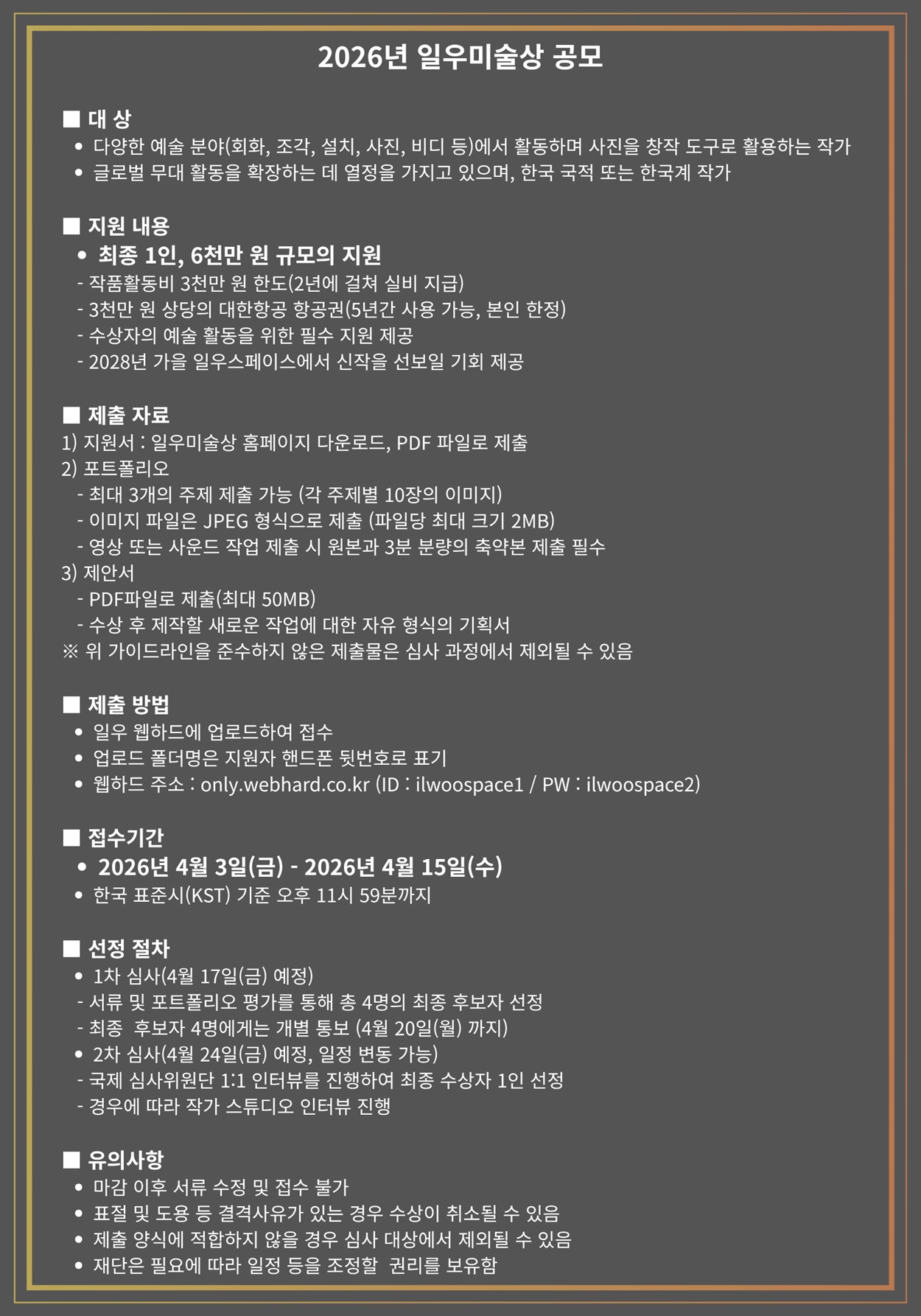 2026 ÀÏ¿ì¹Ì¼ú»ó °ø¸ð ±â°£Àº 3ÀϺÎÅÍ 15ÀϱîÁö´Ù. ÀÀ¸ð ¹æ¹ýÀº Áö¿ø¼¿Í °¢ ÁÖÁ¦º°·Î ±¸¼ºÇÑ Æ÷Æ®Æú¸®¿À, ÇâÈÄ ÀÛ¾÷ ¹æÇâ ³»¿ëÀ» ´ãÀº Á¦¾È¼¸¦ ÀÏ¿ì¹Ì¼ú»ó ȨÆäÀÌÁö(https://ilwoophoto.org/)¿¡ ÀÖ´Â ¾ç½Ä¿¡ µû¶ó ÀÏ¿ìÀç´Ü À¥Çϵå(http://only.webhard.co.kr)¿¡ ¾÷·ÎµåÇØ Á¦ÃâÇÏ¸é µÈ´Ù.