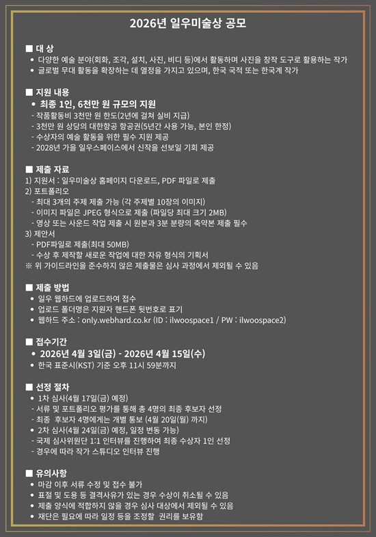 ÀÏ¿ì¹Ì¼ú»óÀº À帣¿Í ¸ÅüÀÇ Á¦ÇÑÀ» µÎÁö ¾Ê°í »çÁøÀ» ÀÛ¾÷ °úÁ¤ÀÇ ÀÏȯÀ¸·Î Ȱ¿ëÇØ Á¦ÀÛµÈ ¸ðµç ÀÛǰÀ» ´ë»óÀ¸·Î ¼±Á¤ÇÑ´Ù. 2026 ÀÏ¿ì¹Ì¼ú»óÀº ÃÑ 1¸íÀ» ÃÖÁ¾ ¼±Á¤ÇØ ÃÑ 3õ¸¸ ¿ø ±Ô¸ðÀÇ ÀÛǰ Á¦ÀÛ È°µ¿ºñ ¹× 3õ¸¸ ¿ø »ó´çÀÇ ´ëÇÑÇ×°ø Ç×°ø±Ç°ú ¡®ÀϿ콺ÆäÀ̽º¡¯¿¡¼ÀÇ °³ÀÎÀü ±âȸ¸¦ Áö¿øÇÑ´Ù.