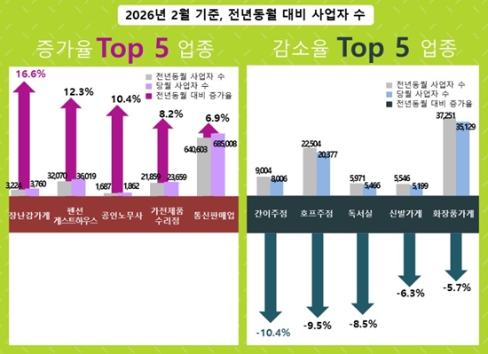 ¿ÃÇØ 2¿ù ¸» ±âÁØ 100´ë »ýȰ¾÷Á¾ »ç¾÷ÀÚ ¼ö°¡ 312¸¸474¸íÀ¸·Î 1³â Àüº¸´Ù 1.5% Áõ°¡ÇÑ °ÍÀ¸·Î ³ªÅ¸³µ´Ù. ¾÷Á¾º° Áõ°¡À²Àº Àå³°¨°¡°Ô°¡ 16.6%·Î °¡Àå ³ô¾Ò°í, Áö¿ªº°·Î´Â °æ±âµµ ¾çÆò±ºÀÇ Áõ°¡À²ÀÌ 11.8%·Î Àü±¹ ÃÖ°í¸¦ ±â·ÏÇß´Ù.