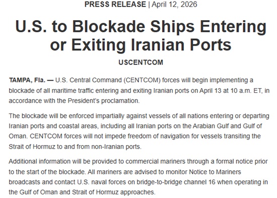 Áߺλç·ÉºÎ´Â 12ÀÏ(ÇöÁö»ç°£) ¡°¹Ì Áߺλç·ÉºÎ±ºÀº ´ëÅë·ÉÀÇ Æ÷°í¿¡ µû¶ó 4¿ù 13ÀÏ ¿ÀÀü 10½Ã(¹Ì µ¿ºÎ½Ã°£, Çѱ¹½Ã°£ 13ÀÏ ¹ã 11½Ã)ºÎÅÍ À̶õ Ç׸¸¿¡ µé¾î¿À°í ³ª°¡´Â ¸ðµç ÇØ»ó±³Åë¿¡ ´ëÇÑ ºÀ¼â¸¦ ½ÃÇàÇϱ⠽ÃÀÛÇÒ °Í¡±À̶ó°í ¹àÇû´Ù.