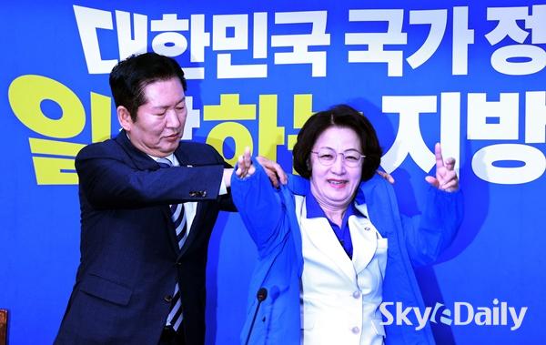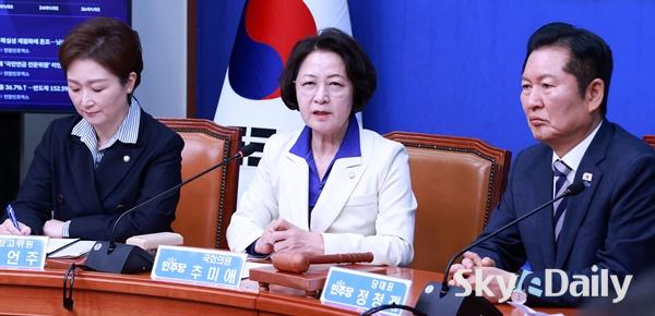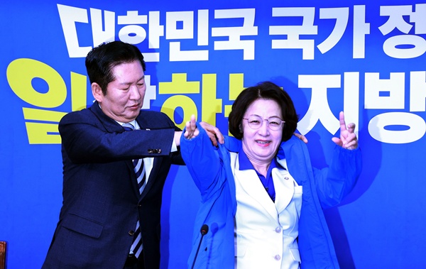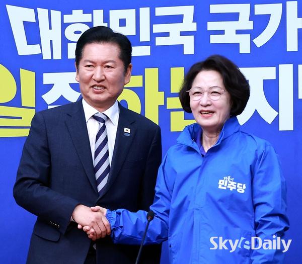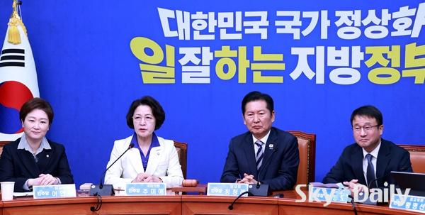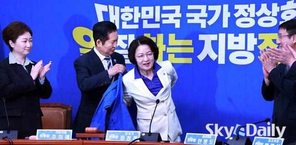 ¡ã ´õºÒ¾î¹ÎÁÖ´ç Á¤Ã»·¡ ´ëÇ¥(¿ÞÂÊ)°¡ 13ÀÏ ¼¿ï ¿©Àǵµ ±¹È¸¿¡¼ °æ±âµµÁö»ç È帷Π¼±ÃâµÈ Ãß¹Ì¾Ö ÀÇ¿ø¿¡°Ô ´ç»öÀÎ ÆÄ¶õ Á¡ÆÛ¸¦ ÀÔÇô ÁÖ°í ÀÖ´Ù. Ãß ÀÇ¿øÀº ¹ß¾ð ¼ø¼°¡ µÇÀÚ ¡°°øÁ÷¼±°Å¹ý»ó Á¡ÆÛ¸¦ ÀÔ°í ¹ß¾ðÇÏÁö ¸øÇϵµ·Ï µÅ ÀÖ´Ù¡±¸ç Á¡ÆÛ¸¦ ¹þÀº ÈÄ ¡°°æ±âµµ´Â ´ëÇѹα¹ »ê¾÷ÀÇ ½ÉÀåÀÌ ÀÖ´Â ÇÙ½É »ê¾÷ °ÅÁ¡¡±À̶ó¸ç ´ç Â÷¿øÀÇ Áö¿øÀ» ´çºÎÇß´Ù. ÀÌÁ¾¿ø ±âÀÚ ¨Ï½ºÄ«À̵¥Àϸ®