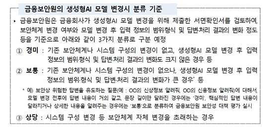 À̹ø Á¦µµ °³¼±¿¡ µû¶ó, »ý¼ºÇü AI ¸ðµ¨À» º¯°æÇϰíÀÚ ÇÏ´Â ±ÝÀ¶È¸»ç´Â º¯°æ »çÇ×ÀÌ º¸¾È¿¡ ¹ÌÄ¡´Â ¿µÇâÀ» »çÀü¿¡ Á¡°ËÇÑ ¡®¼¸éÈ®Àμ¡¯¸¦ Çѱ¹ÇÉÅ×Å©Áö¿ø¼¾ÅÍ¿¡ Á¦ÃâÇÏ¸é µÈ´Ù. ÀÌÈÄ ±ÝÀ¶º¸¾È¿øÀÌ ¼¸éÈ®Àμ¸¦ °ËÅäÇØ º¸¾È ¿µÇâµµ¸¦ °æ¹Ì, º¸Åë, »ó´ç µî 3´Ü°è·Î ºÐ·ùÇÑ´Ù.