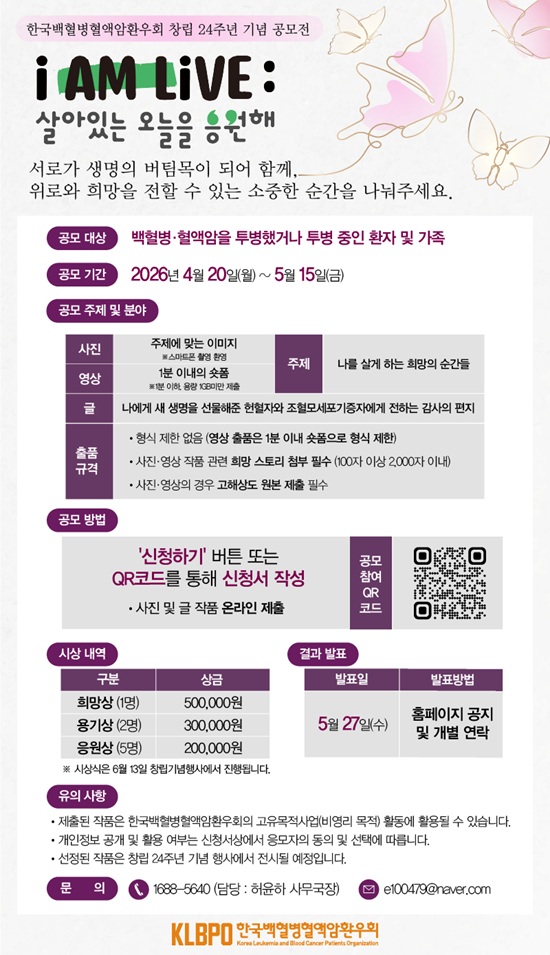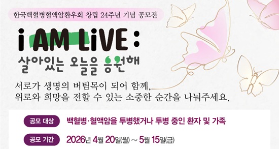 Çѱ¹¹éÇ÷º´Ç÷¾×¾Ïȯ¿ìȸ´Â ⸳ 24ÁÖ³âÀ» ¸Â¾Æ °ø¸ðÀü ¡®I AM LIVE; »ì¾ÆÀÖ´Â ¿À´ÃÀ» ÀÀ¿øÇØ¡¯¸¦ 20ÀϺÎÅÍ ÁøÇàÇÑ´Ù°í ¹àÇû´Ù. ȯÀÚ¿Í °¡Á·ÀÌ Åõº´ °úÁ¤¿¡¼ ¸¶ÁÖÇÑ Èñ¸ÁÀÇ ¼ø°£°ú »ý¸í³ª´®¿¡ ´ëÇÑ °¨»çÀÇ ¸¶À½À» Á÷Á¢ ´ã¾Æ³»´Â ¹æ½ÄÀÇ Ä·ÆäÀÎÀÌ´Ù.
