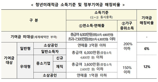 ÀϹÝÇüÀº Ãѱ޿© 6000¸¸ ¿ø ÀÌÇÏ ¶Ç´Â ¿¬¸ÅÃâ 3¾ï ¿ø ÀÌÇÏ ¼Ò»ó°øÀο¡°Ô Àû¿ëµÇ¸ç Á¤ºÎ°¡ ¿ù ³³ÀÔ¾×ÀÇ 6%¸¦ Áö¿øÇÑ´Ù. ¿ì´ëÇüÀº Ãѱ޿© 3600¸¸ ¿ø ÀÌÇÏ Áß¼Ò±â¾÷ ÀçÁ÷ÀÚ, ¿¬¸ÅÃâ 1¾ï ¿ø ÀÌÇÏ ¼Ò»ó°øÀÎ, ¶Ç´Â ÀϹÝÇü ¼Òµæ ±âÁØÀ» ÃæÁ·ÇÏ´Â Áß¼Ò±â¾÷ ½Å±Ô Ãë¾÷ÀÚ°¡ ´ë»óÀ̸ç Á¤ºÎ°¡ 12%¸¦ Áö¿øÇÑ´Ù. Ãѱ޿© 6000¸¸ ¿ø Ãʰú 7500¸¸ ¿ø ÀÌÇÏ ±¸°£Àº Á¤ºÎ ±â¿©±Ý ¾øÀÌ ºñ°ú¼¼ ÇýÅø¸ ¹Þ´Â´Ù.
