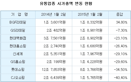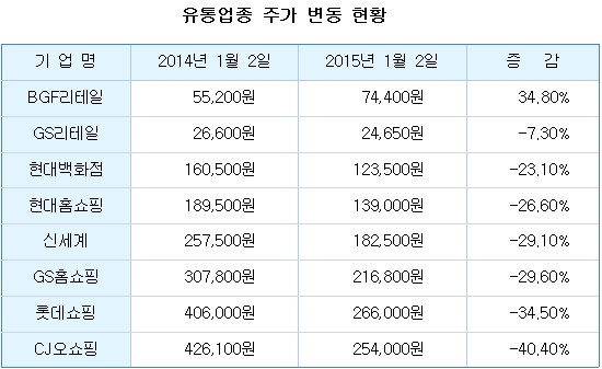 Áö³ÇØ À¯Åë°¡´Â ½ä··Çß´Ù. ¼Òºñ½É¸®°¡ ²Ç²Ç ¾ó¸é¼ ¼ÒºñÀÚµéÀº Á»Ã³·³ Áö°©À» ¿ ÁÙ ¸ô¶ú´Ù. ¿©±â¿¡ ÇØ¿ÜÁ÷±¸Á·ÀÇ Áõ°¡µµ À¯Åë¾÷ ºÎÁø¿¡ ÇѸòÀ» ÇßÀ¸¸ç, À¯Åë¾÷ü´Â ½ÇÀûÇ϶ôÀÇ Á÷°ÝźÀ» ¸Â°í ¿ï»óÀ» Áö¾ú´Ù. ´õ¿íÀÌ À̰°Àº Çö»óÀº ¿ÃÇØµµ À̾îÁú °ÍÀ¸·Î Àü¸ÁµÇ¸é¼ À¯Åë¾÷°è´Â ÂîǪ¸° ÀλóÀ» Æì±â°¡ ¾î·Æ°Ô µÆ´Ù. Ȩ¼îÇÎÀÇ °æ¿ì, TV½Ãû·üÀÌ Ç϶ôÇÏ¸é¼ ¾÷°èÀÇ È£È²µµ °ú°Å°¡ µÆ´Ù. ÇØ´ç¾÷Á¾¿¡ ÅõÀÚÇÑ °³ÀÎÅõÀÚÀÚµéÀº ¶³¾îÁö´Â ÁÖ°¡°î¼±°ú ÇÔ²² °í°³¸¦ ¶³±É´Ù. ÀÌ¿¡ µû¶ó ·Ôµ¥¼îÇΡ¤½Å¼¼°è¡¤Çö´ë¹éÈÁ¡¡¤GS¸®Å×ÀÏ¡¤BGF¸®Å×ÀÏ¡¤CJ¿À¼îÇΡ¤GSȨ¼îÇΡ¤Çö´ëȨ¼îÇÎ µî À¯Åë¾÷Á¾ ´ëÇ¥ÁÖÀÚµéÀÇ ½Ã°¡ÃѾ×Àº ÇѲ¯ Âɱ׶óµé¾ú´Ù. ÇØ´ç¾÷üµéÀÇ ½Ã°¡ÃÑ¾× ÇÕÀº 1³â¸¸¿¡ 7Á¶9605¾ï¿øÀÌ ³¯¾Æ°¬´Ù. Áö³ÇØ 1¿ù 2ÀÏ ÃÑ 29Á¶4226¾ï¿øÀ̾ú´ø ½Ã°¡ÃѾ×ÀÌ 21Á¶4621¾ï¿øÀ¸·Î 27.1%³ª Áõ¹ßÇÑ °ÍÀÌ´Ù. ³»¼ö ¼Òºñ ħü¿Í ¸ð¹ÙÀÏ ¼îÇÎÀÇ ¼ºÀåÀº ¹éÈÁ¡¿¡°Ô´Â Ä¡¸íŸ¿´´Ù. ´õ¿íÀÌ ¹éÈÁ¡¿¡¼ ¹°°ÇÀ» °í¸£°í ±¸¸Å´Â ÀÎÅͳÝÀ¸·Î ÇÏ´Â ¡®Å©·Î½º¿À¹ö¡¯Á·ÀÇ Áõ°¡µµ ¸ÅÃâ°ú ÁÖ°¡Ç϶ô, ½Ã°¡ÃÑ¾× °¨¼Ò¿¡ ¿µÇâÀ» Áá´Ù. Ȩ¼îÇÎÀÇ ½ÃÃÑ Áõ¹ß¿¡´Â °è¼ÓµÇ´Â TV½Ãû·ü Ç϶ô¡¤ÇØ¿ÜÁ÷±¸ÀÇ Áõ°¡·Î ÀÎÇÑ TVȨ¼îÇÎ ½ÃÀå ħ½ÄÀÇ ¿µÇâÀÌ Å©´Ù´Â ºÐ¼®ÀÌ´Ù. ½ºÄ«À̵¥Àϸ®°¡ ³× ¹øÂ°·Î ºÐ¼®ÇÒ Á¾¸ñÀº À¯Åë¾÷ÀÌ´Ù. Àü¹ÝÀûÀ¸·Î ¿ÃÇØµµ ºÎÁ¤ÀûÀÎ ¿ä¼Ò°¡ »êÀçÇØ ÀÖ´Â À¯Åë¾÷°è¿¡¼ EPS¿Í PERÀÌ °¡Àå ±àÁ¤ÀûÀ¸·Î ³ªÅ¸³ °÷Àº Çö´ë¹éÈÁ¡À¸·Î Á¶»çµÆ´Ù. Áõ±Ç°¡¿¡¼´Â ¿ÃÇØ À¯Åë¾÷ Àü¹Ý¿¡ ºÎÁ¤ÀûÀÎ ½Ã°¢À» º¸¿´Áö¸¸, ±×³ª¸¶ ÆíÀÇÁ¡¿¡ ±â´ë°¨À» ³ªÅ¸³Â´Ù.